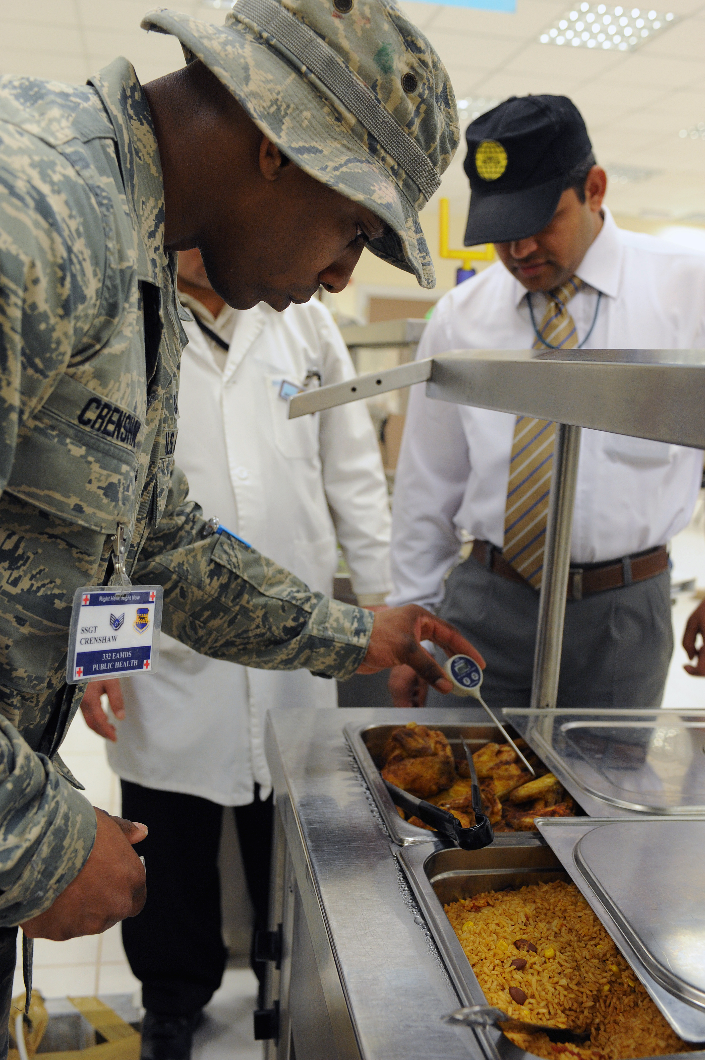 EAT UP! - FOOD SAFETY A PRIORITY FOR DEPLOYED Published June 15, 2010 By Senior Airman Wes Carter 332nd Air Expeditionary Wing JOINT BASE BALAD, Iraq (AFNS) -- Every day thousands of Airmen, Sailors, Soldiers and con-tractors walk through the doors of Dining Facility Two here for breakfast, lunch and dinner. Thankfully, they can eat up without worrying about if the food they are consuming is safe. The 332nd Expeditionary Aerospace Medical Squadron's Public Health Flight staff inspects the food deployed servicemembers and contractors consume daily. "We check how the food is stored, what temperature it is cooked at and what the environment it is stored in looks like, among other things," said Staff Sgt. Jennifer Ledward, a 332nd EAMS public health technician. "Our number one priority is to ensure people aren't susceptible to food poisoning or other food-borne illnesses. Anything that affects the whole population involves us." The Public Health Flight deemed Dining Facility Two well above satisfactory during a detailed check in March. Each monthly inspection is unannounced to prevent the facility staff from preparing. "We gave the dining facility a rating of 'excellent,' " Ledward said. "In order to receive this high of a mark, the facility has two satisfactory ratings in a row. This ensures they are being consistently conscious of potential health issues." It's important to remember that public health Airmen aren't just trying to keep a few people from a trip to the clinic, Ledward said. In a deployed location, the health of every Airman is vital, so the dining facilities must be held accountable, she added. "It gives me peace of mind that when I come in here I won't get sick," said Tech. Sgt. Brian Jackson, a 332nd Expeditionary Security Forces Squadron member. "My unit already has a high mission tempo right now. For me to be out of the picture because I am sick would cause them to have to grab someone else. "It would affect the whole mission from the top down," he added.