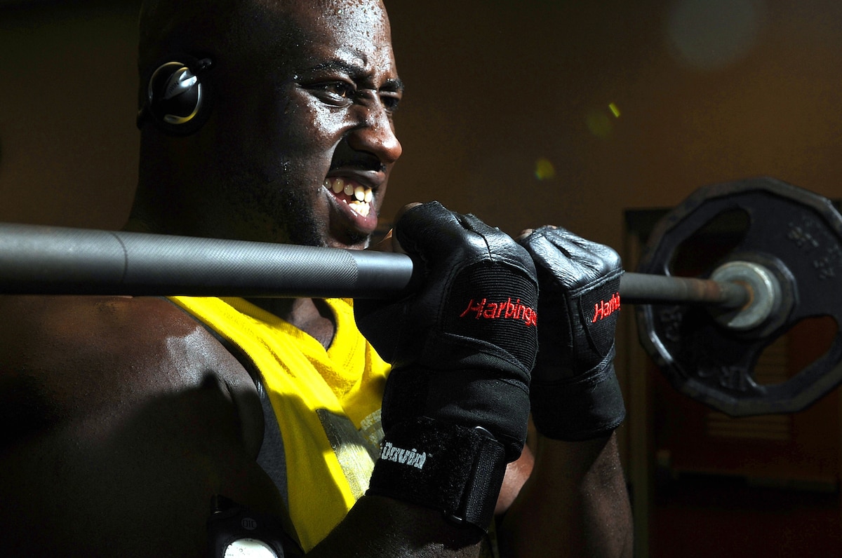 As part of his workout regimen. Dominick Ward lifts weights a half hour every day, five days a week at the fitness center on Charleston AFB, S.C. Along with a daily two-mile run, this exercise routine has led to his dramatic weight loss of 120 pounds... and counting! (U.S. Air Force photo by Staff Sgt. Angelita Lawrence)
