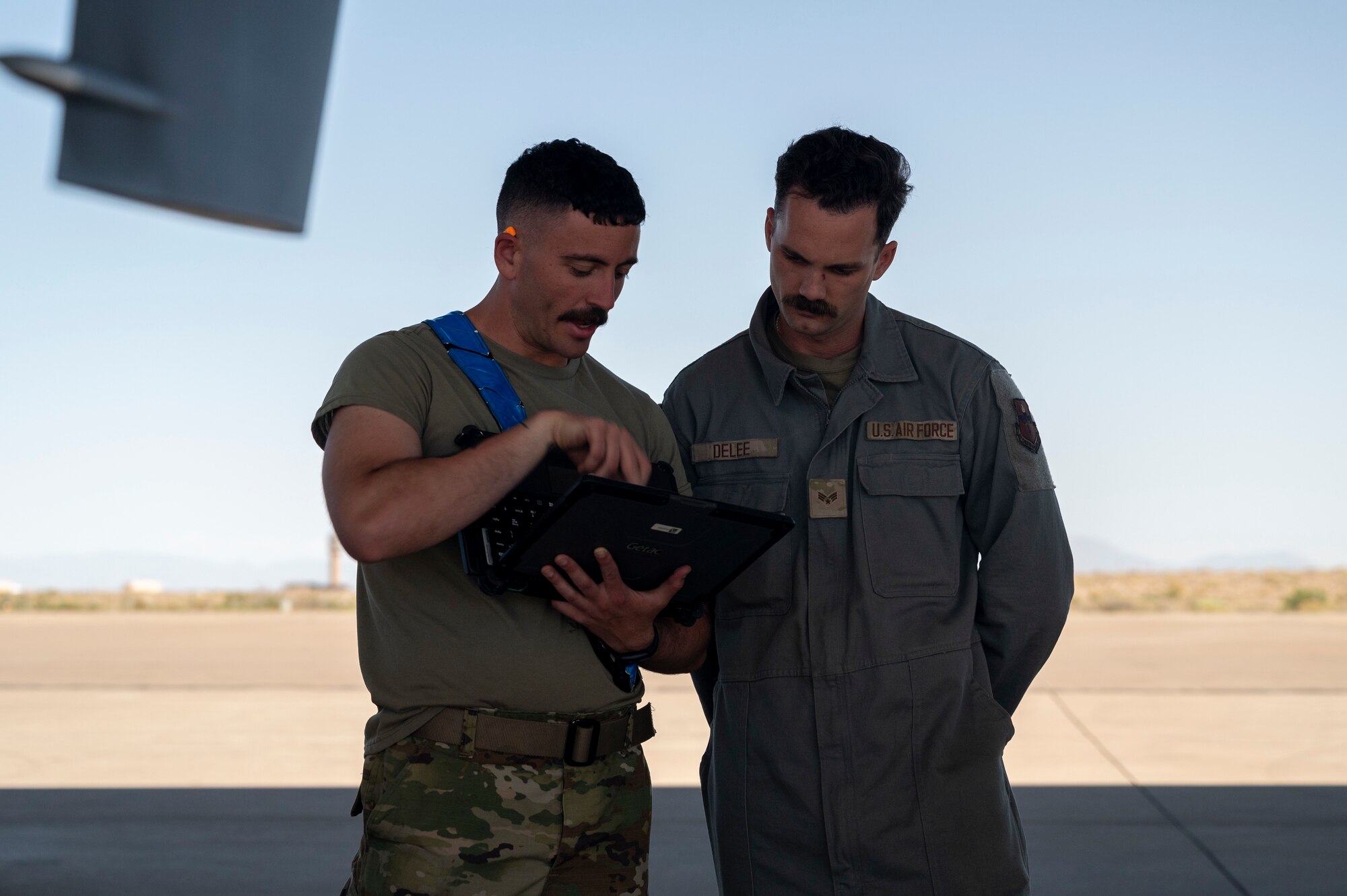 U.S. Air Force Senior Airman Daniel Knight, 49th Aircraft Maintenance Squadron assistant dedicated crew chief, left, reviews technical orders with U.S. Air Force Senior Airman Braden Delee, 49th AMXS crew chief, at Holloman Air Force Base, New Mexico, June 11, 2024. The 49th AMXS is responsible for the upkeep and maintenance of all MQ-9 Reapers on Holloman AFB. (U.S. Air Force photo by Senior Airman Nicholas Paczkowski)