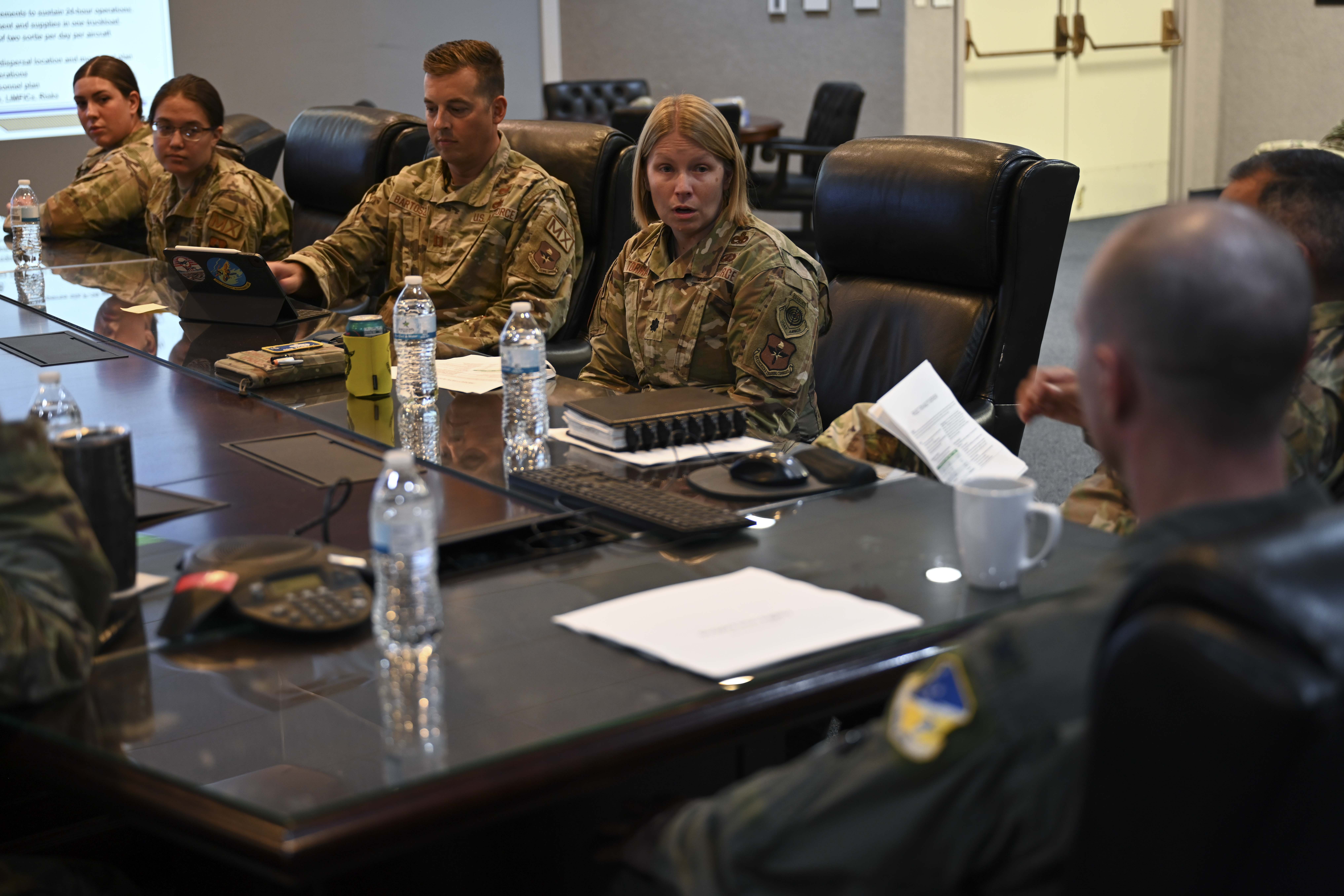 U.S. Air Force Lt. Col. Kristen Torma, 49th Maintenance deputy commander, presents Project Iron Agility tactics training program to the base commander at Holloman Air Force Base, Aug. 9, 2024. The maintenance knowledge curriculum taught at PIA implements training tactics and procedures to prepare Airmen for deployment scenarios. (U.S. Air Force photo by Airman 1st Class Michelle Ferrari)