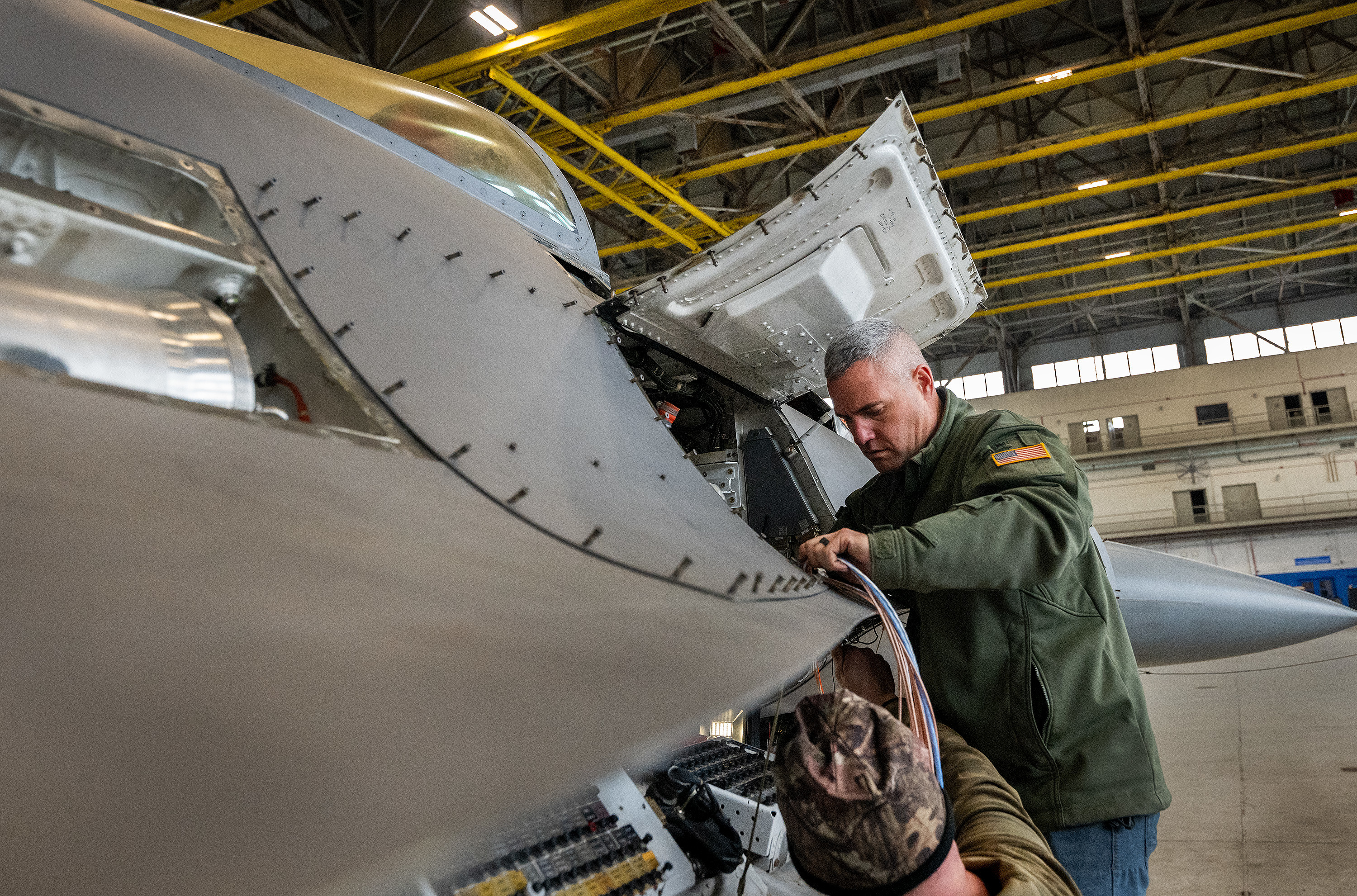 Chris Kiser, an aviation engineer, works on modifying an F-16 Fighting Falcon’s wiring as part of Viper Experimentation and Next-gen Operations Model – Autonomy Flying Testbed program at Eglin Air Force Base, Florida. The changes include software, hardware and instrumentation that will allow the aircraft to fly autonomously. (U.S. Air Force photo by Samuel King Jr.)